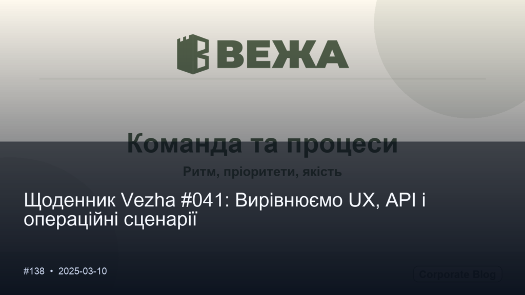 Випуск #041 від 10.03.2025: «Вирівнюємо UX, API і операційні сценарії» у Vezha. Про рішення тижня без зайвої теорії — тільки практичний результат і наступний фокус.