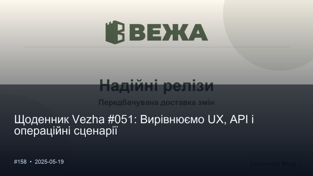 Випуск #051 від 19.05.2025: «Вирівнюємо UX, API і операційні сценарії» у Vezha. Про рішення тижня без зайвої теорії — тільки практичний результат і наступний фокус.
